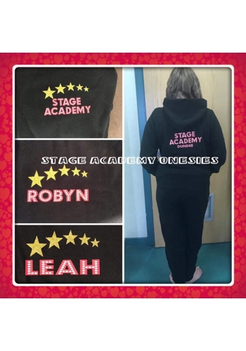 Stage Academy Onesie has the SA logo on the back and Students name on the front.